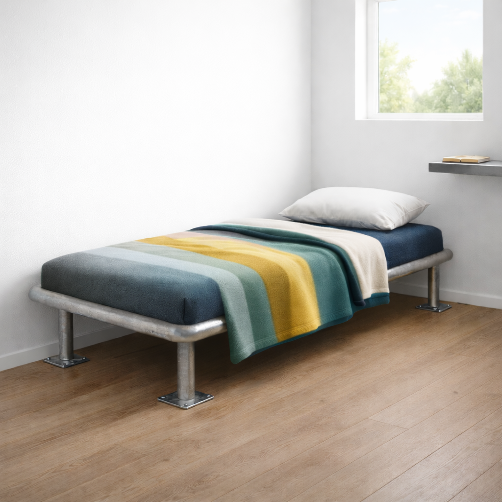 Łóżko nierdzewne Rokmob® oferuje optymalną trwałość w bardzo wymagających środowiskach ( zaburzenia zachowania, płyny ustrojowe, uderzenia, wandalizm).
